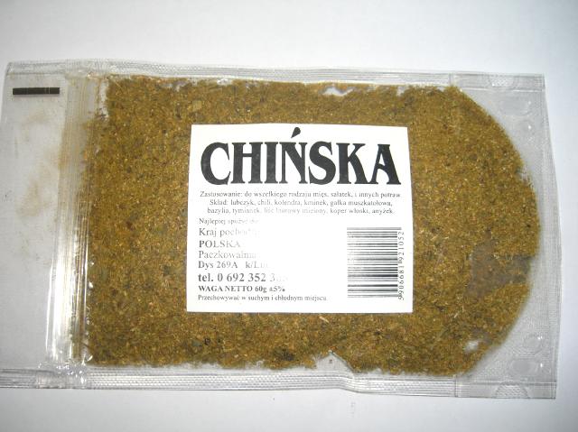 Przyprawa chińska to mix uniwersalnych składników, które swym smakiem oraz aromatem nawiązują do ogromnych tradycji kuchni orientalnej. W owej recepturze można znaleźć przyprawy charakterystyczne dla chińskiej sztuki kulinarnej – zaliczamy do nich m.in. Kminek, kurkumę, anyż, tymianek, a także gałkę muszkatołową. Nie bez znaczenia jest także obecność odpowiadającej za ostrość papryczki chili. Dodatki w postaci kolendry, lubczyku, liści laurowych, jak również kopru włoskiego również dodają intensywności smaku oraz głębokiego aromatu. Mieszanka znajduje się w szczelnym opakowaniu o zawartości 60g.