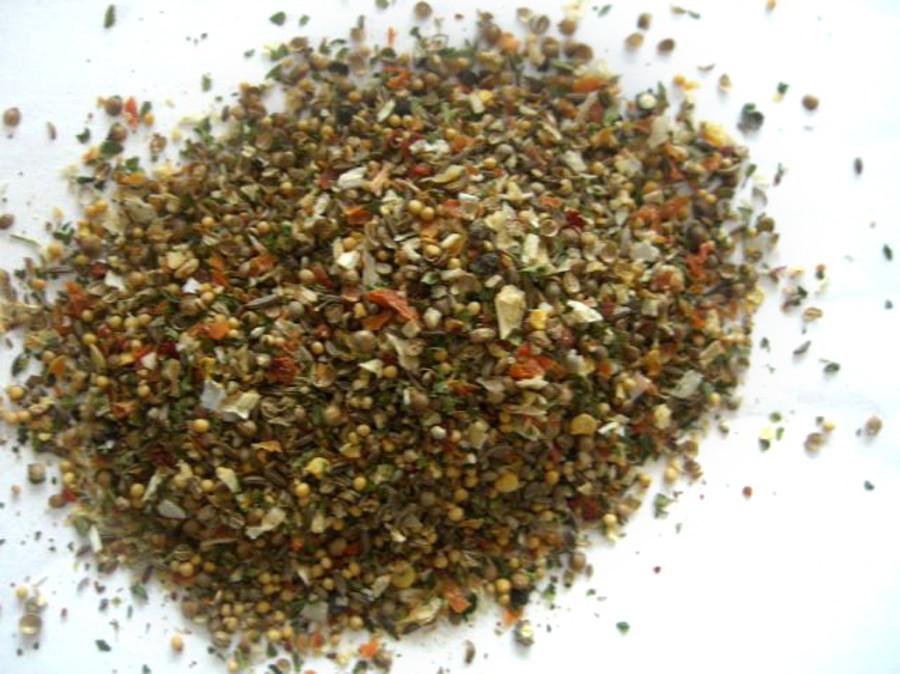 Kminek cały, pieprz tłuczony, cebula suszona, marchewka suszona, gorczyca biała, pietruszka nać, papryka czerwona i zielona, gryz, kolendra.