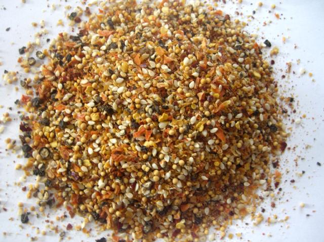 Marchew grys, gorczyca biała grys, papryka grys, pieprz grys, sezam. Bez glutaminianu sodu