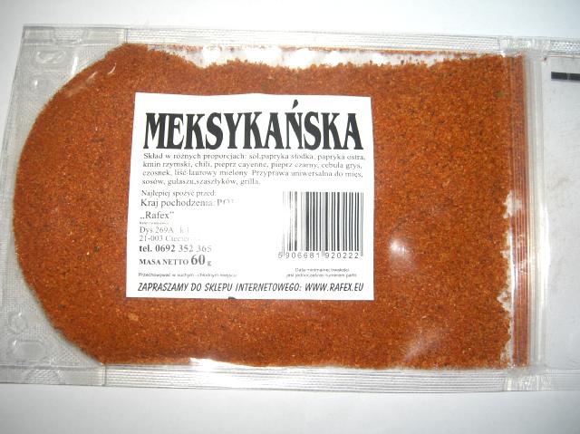 Niezwykła i bardzo bogata mieszanka przypraw i smaków kuchni meksykańskiej. Wyjątkowe połączenie cebuli, czosnku, chili czy pieprzu cayenne z dodatkiem kminu rzymskiego. Prawdziwe bogactwo natury, suszone naturalnie, tradycyjnymi metodami co sprawia, że wszelkie wartości odżywcze pozostają bez uszczerbku. Przyprawa jest bogata w sole mineralne, witaminy, mikro- i makroelementy. Dodatkowo wyróżnia się nietypowym, orientalnym smakiem z kuchni meksykańskiej. Smak i świeżość zawarte w przyprawie meksykańskiej ukazuje prawdziwe oblicze kuchni Tex-Mex. Do nabycia w opakowaniach o pojemności 60 g.
