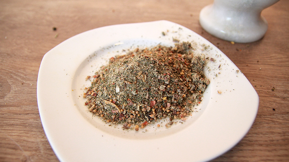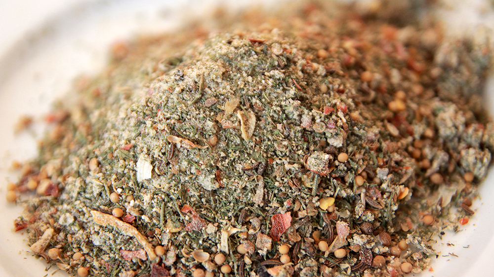 marchew grys, gorczyca, papryka grys, pieprz grys, sezam, chili grys, kminek cały, pieprz tłuczony, cebula suszona, pietruszka nać, papryka czerwona i zielona, kolendra, czosnek granulowany, ekstrakt czosnku, koper nać, pieprz czarny, kwasek cytrynowy, maltodekstryna, sól